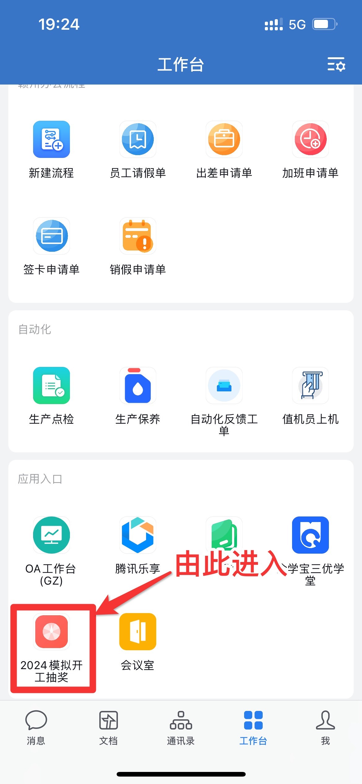 進入企業(yè)微信,點擊“工作臺”→“應用入口”→“2024開工抽獎”→進入抽獎頁面;