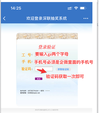 進入抽獎頁面后,填寫自己的工號和手機號,并獲取驗證碼,填寫完驗證碼后進入大轉(zhuǎn)盤抽大獎?。ㄗ⒁猓憾绦膨炞C碼保留一天,若想再次登錄抽獎頁面,直接用第一次獲取的驗證碼)