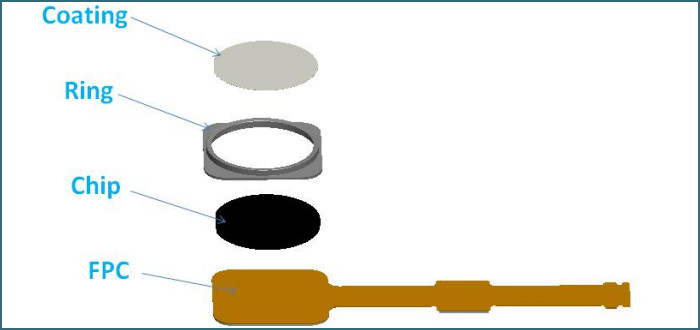 如下圖,為一款典型的按壓式指紋識別模組及分解圖,一個完整的指紋識別模組主要由:Cover、Ring,指紋識別Chip和承載ChiP的FPC組成。