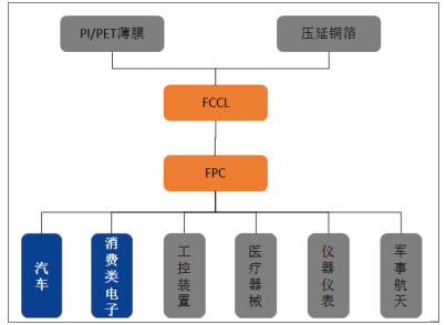 軟板產(chǎn)業(yè)鏈上游主要原材料包括撓性覆銅板(FCCL)、覆蓋膜、元器件、屏蔽膜、膠紙、鋼片、電鍍添加劑、干膜等八大類,其中FCCL的板材膜常見的有聚酰亞胺膜(PI)、聚酯(PET)、聚萘二甲酸乙二醇酯(PEN)、液晶顯示屏高聚物(LCP)等高分子材料塑料薄膜;中游為FPC制造;下游為各類應(yīng)用,包括顯示/觸控模組,指紋識別模組、攝像頭模組等,最終應(yīng)用包括消費電子、通訊設(shè)備、汽車電子、工控醫(yī)療、航空航天等領(lǐng)域。