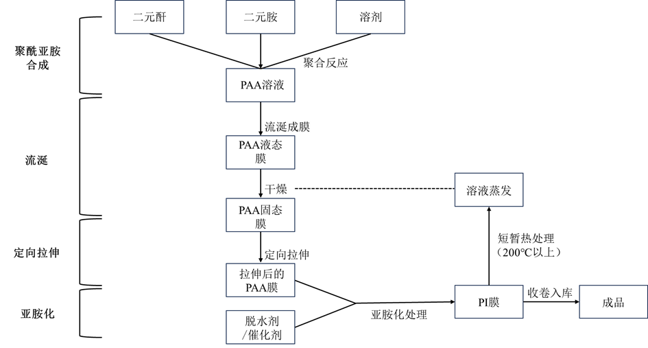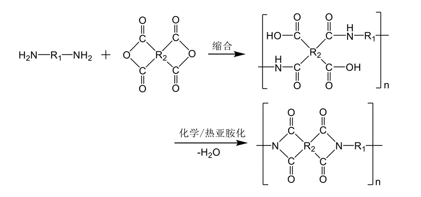 PI 作為一種具有優(yōu)異綜合性能的特種工程塑料,主要特征是其主鏈上含有酰亞胺環(huán),通常是由二胺和二酐單體在非質(zhì)子極性有機(jī)溶劑中低溫縮聚反應(yīng)生成聚酰胺酸溶液,再脫水環(huán)化而得。