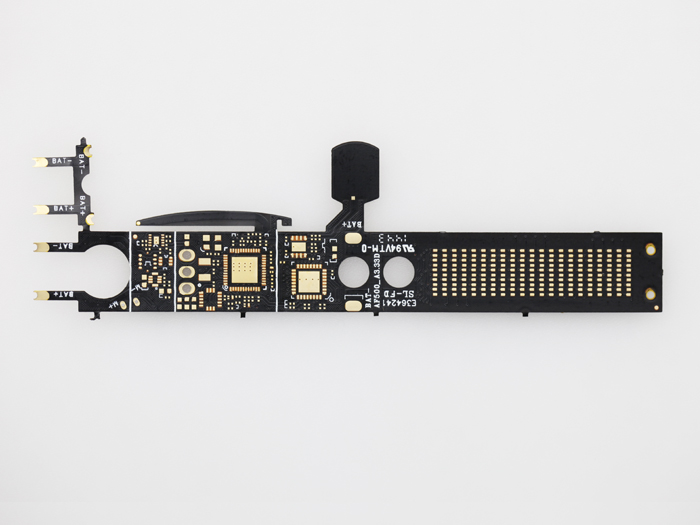 型 號(hào):RM01C00187A層 數(shù):1板 厚:0.12mm材 料:?jiǎn)蚊嬗心z電解銅 厚:1/2 OZ表面處理:沉金2微英寸最小線寬/線距:0.1mm/0.08mm特 點(diǎn):外形復(fù)雜