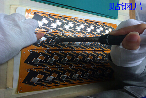 1.貼鋼片:用不銹鋼片貼在軟板相應(yīng)的位置上,用來(lái)局部補(bǔ)強(qiáng)該區(qū)域的軟板使其不至于彎折的工藝;