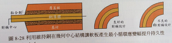 幾何中心的觀念對FPC相當(dāng)重要,理論上任何結(jié)構(gòu)的中心位置在彎折時都幾乎保持在不動的狀態(tài),這樣應(yīng)力就都被外部層材料所吸收。因此,如果銅薄膜是保持在設(shè)計的中心,撓曲壽命應(yīng)該都可以提升,如圖8-28所示。