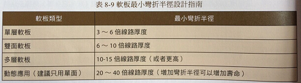 利用有限元素分析可以模擬預(yù)估建議的彎折極限,有一些普遍使用的指南可以做為參考。對一般軟板彎折,設(shè)計可以參考表8-9的數(shù)據(jù)。對于非常高撓曲壽命的動態(tài)FPC設(shè)計,利用制造測試樣品來驗證還是比較傾向使用的方式。