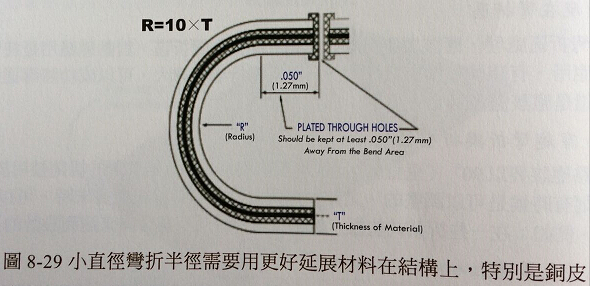 FPC對彎折區(qū)處理,應(yīng)該要避免讓電鍍通孔配置在彎折區(qū),對動態(tài)應(yīng)用是特別重要的事項。對靜態(tài)應(yīng)用,有時候如果有良好的保護(hù)膜且彎折半徑夠大,可以成功將導(dǎo)通孔配置在彎折區(qū),不過還是應(yīng)該盡量避免。