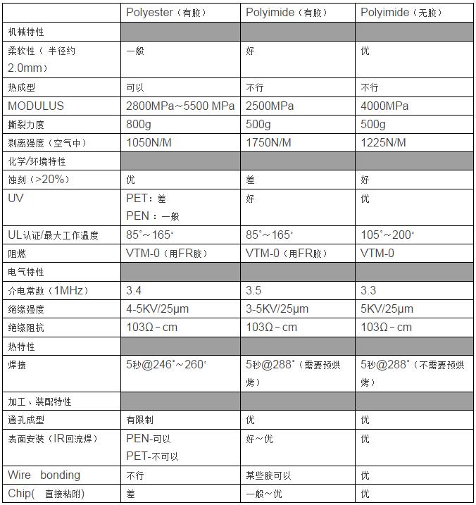 根據(jù)需求的不同,柔性電路板使用的板材也不一樣??梢詮膽玫膱龊霞俺杀镜确矫婕右跃C合考慮。常用的有Polyimide(聚酰亞胺,分有膠和無膠)和Polyester(聚酯)。這幾種材料的特性比較如下表所示: