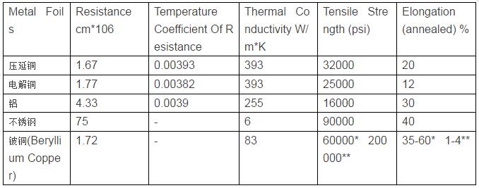 除了銅箔以外,柔性板的其它導體材料還有銅鎳合金(比如Constantan)和導電涂料。導電涂料是導電材料(如銀,碳等)混合聚合物粘接劑(如樹脂)構(gòu)成的漿狀物。導電涂料印刷在介質(zhì)表面,然后再覆蓋起來。例如銀漿,如果覆蓋絕緣好的話,它的導電性能也是非常不錯的。導電涂料與銅箔相比電氣性能稍遜,阻抗系數(shù)也比較高,在某些應用柔性場合不適合用它做導體。下表列出各種金屬薄膜的特性比較。