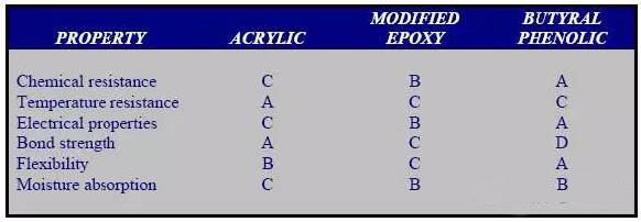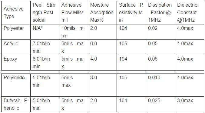 在柔性板設計時,選擇合適的膠來粘接導體和介質(zhì)也是非常重要的。它必須保證FPC 在加工時不脫膠或不過多地溢膠。柔性板常用的膠有丙烯酸(acrylic),改良環(huán)氧樹脂(modified epoxy), 酚丁縮醛(Phenolic Butyrals),增強膠,壓敏膠等等。下表列舉了幾種膠的特性。