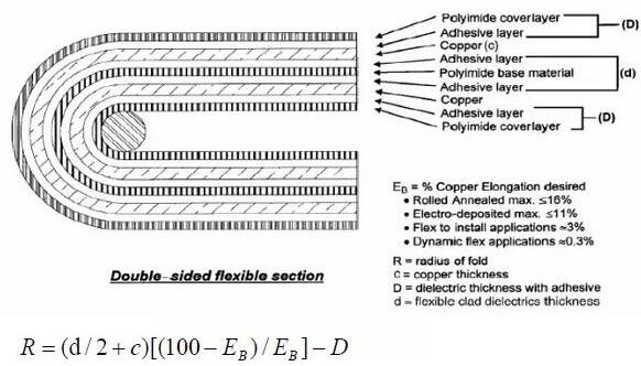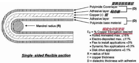 而且在不同的使用場(chǎng)合,同一材料的銅皮變形量取值也不一樣。對(duì)于一次性彎曲的的場(chǎng)合,使用折斷臨界狀態(tài)的極限值(對(duì)延碾銅,該值為16%)。對(duì)于彎曲安裝設(shè)計(jì)情況,使用IPC-MF-150規(guī)定的最小變形值(對(duì)延碾銅,該值為10%)。對(duì)于動(dòng)態(tài)柔性應(yīng)用場(chǎng)合,銅皮變形量用0.3%。而對(duì)于磁頭應(yīng)用,銅皮變形量用0.1%。通過(guò)設(shè)置銅皮允許的變形量,就可以算出彎曲的最小半徑。