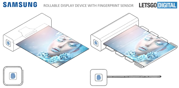 該專利顯示了圓柱形和正方形的形狀。兩種都具有指紋傳感器,使用者只需用指紋激活就能展開卷曲的顯示屏。