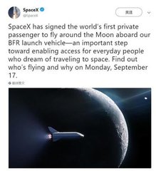 該公司在推特上寫道:“SpaceX與全球首位乘客簽署合同,該游客將搭乘‘大獵鷹’火箭(BFR)繞月飛行。這是向夢(mèng)想在太空旅行的普通民眾開放的重要一步。”