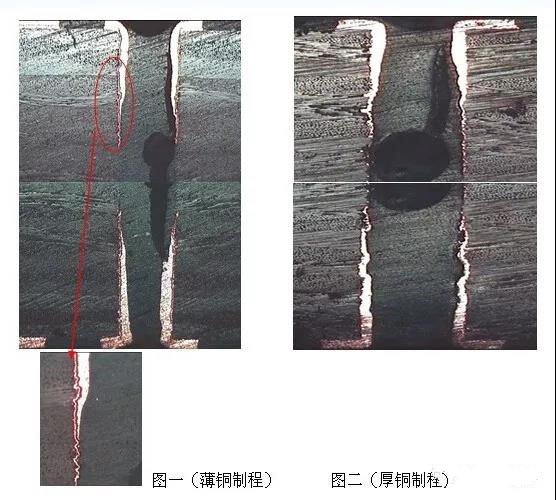 孔金屬化是PCB制程中最重要的工序,本文就一種漸薄類型的孔無銅表現(xiàn)形態(tài)、成因及解決方案談一點(diǎn)FPC廠的理解和認(rèn)識。漸薄類型的孔無銅均有一共性,即:孔內(nèi)銅層從孔口至孔中央逐漸減薄,直至銅層消失。具體圖片如下:
