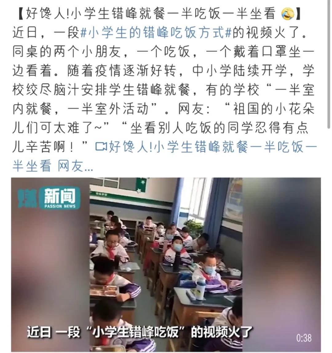 當(dāng)天,還有這么一所學(xué)校也火了。視頻顯示,這家小學(xué)推行錯峰吃飯,一半孩子先在吃飯,而另一半孩子則佩戴好口罩,雙手放在桌子上坐好。小朋友,你是否有很多問號??為什么別人都在吃飯,我卻只能看著……