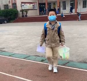 4月13日,四川武勝沿口小學(xué)開始復(fù)學(xué)復(fù)課,在這天早上,一位背著書包的小男孩拎著桶來到學(xué)校報到。