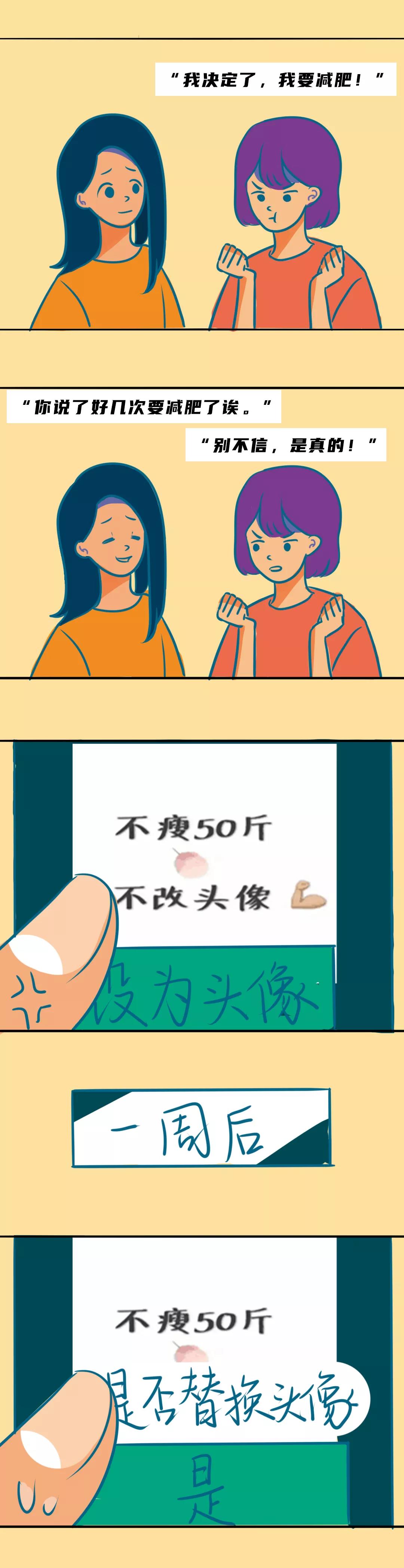 相信好多人都見過那種非常勵志的頭像:全都是“不瘦??斤不換頭像!”。但沒過幾天,你就會發(fā)現(xiàn),這個曾經(jīng)激勵人的頭像不見了——被悄無聲息地換了下來,然而那時候并沒有瘦多少斤!