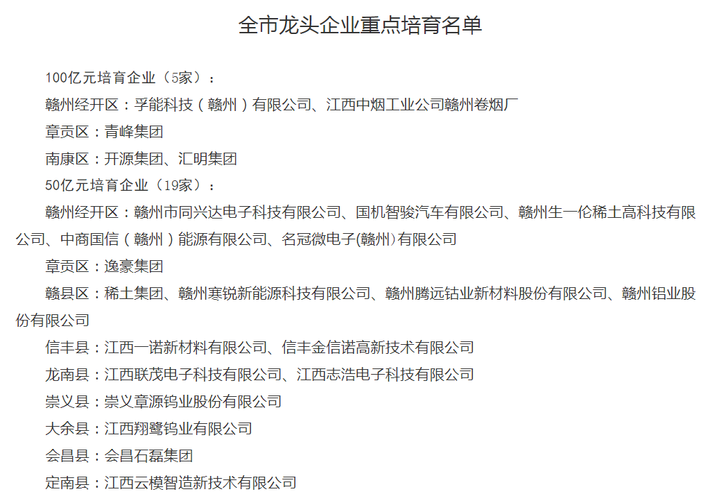通知里講到,為深入貫徹贛州市市委、市政府“主攻工業(yè),三年再翻番”決策部署,全力培育一批營業(yè)收入超50億元、100億元的大型龍頭企業(yè),引領(lǐng) “兩城兩谷兩帶”產(chǎn)業(yè)轉(zhuǎn)型升級、做大做強(qiáng),推動贛州市工業(yè)經(jīng)濟(jì)高質(zhì)量跨越式發(fā)展。