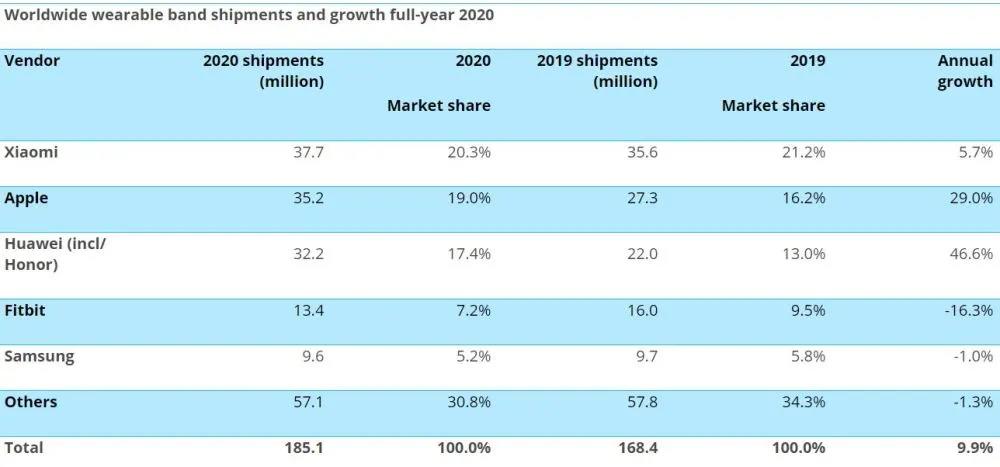 全球可穿戴設備市場在特殊的2020年經受住了考驗,最終全年出貨量為1.85億件,同比2019年增長了9.9%,這算是一個還不錯的成績。