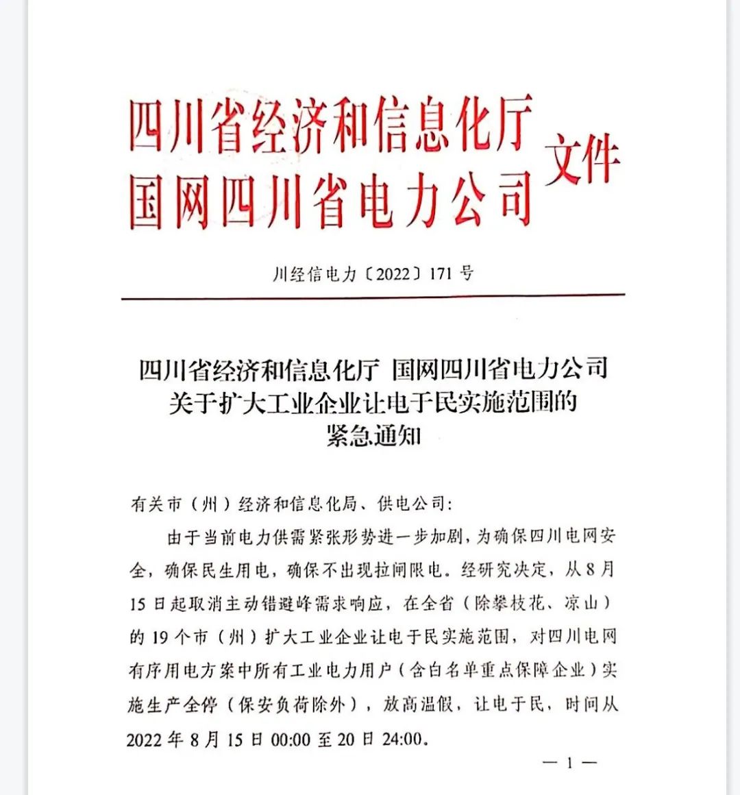 據(jù)深聯(lián)電路柔性電路板小編了解,8月15日,一份由四川省經(jīng)濟(jì)和信息化廳和國(guó)網(wǎng)四川省電力公司聯(lián)合下發(fā)的文件《關(guān)于擴(kuò)大工業(yè)企業(yè)讓電于民實(shí)施范圍的緊急通知》顯示,要求所有工業(yè)用電企業(yè)(含白名單重點(diǎn)保障企業(yè))生產(chǎn)全停6日。