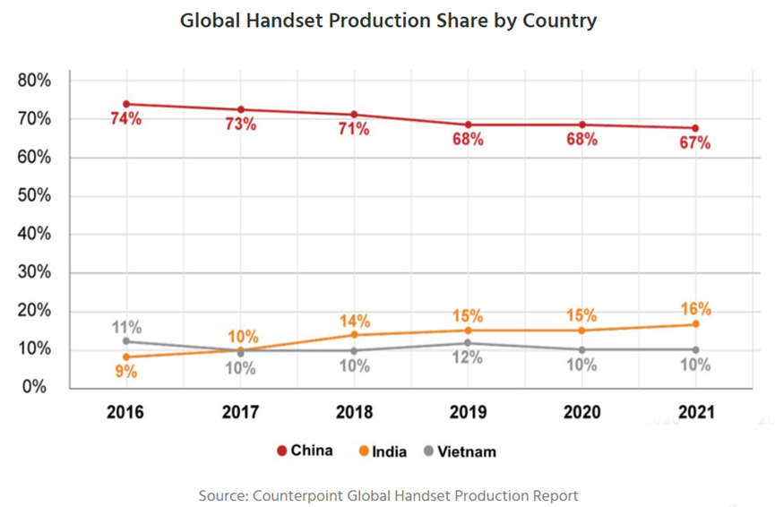 據(jù)深聯(lián)電路柔性線路板小編了解,自2016年以來,中國在手機生產(chǎn)市場中的份額正逐漸減少,雖然每年變化的幅度不大,但從整體來看,中印之間的差距已經(jīng)有了明顯的縮小。其中,2021年,中國生產(chǎn)了全球67%的手機,雖然依舊占據(jù)著市場的領(lǐng)導(dǎo)地位。