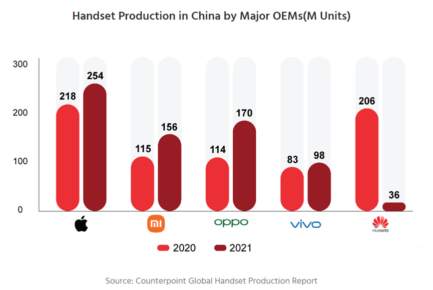 據(jù)柔性線路板小編了解,數(shù)據(jù)顯示,2021年,蘋果、小米、OPPO、vivo、華為分別在中國生產(chǎn)了2.54億臺、1.56億臺、1.70億臺、9800萬臺、3600萬臺手機;Counterpoint此前發(fā)布的數(shù)據(jù)顯示,2021年蘋果、小米、OPPO、vivo的出貨量分別為2.38億臺、1.90億臺、1.43億臺、1.31億臺。