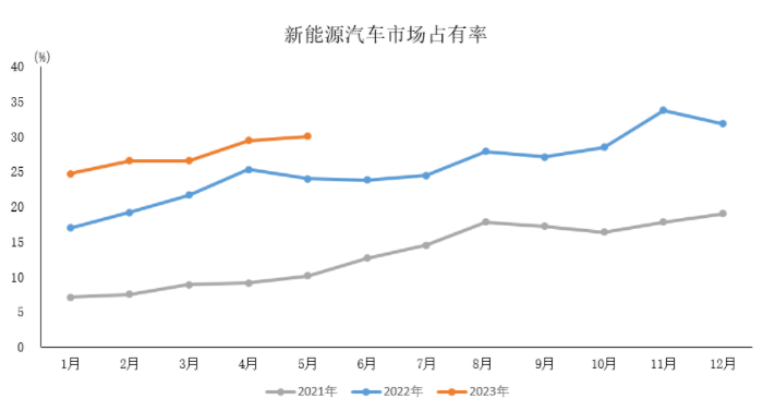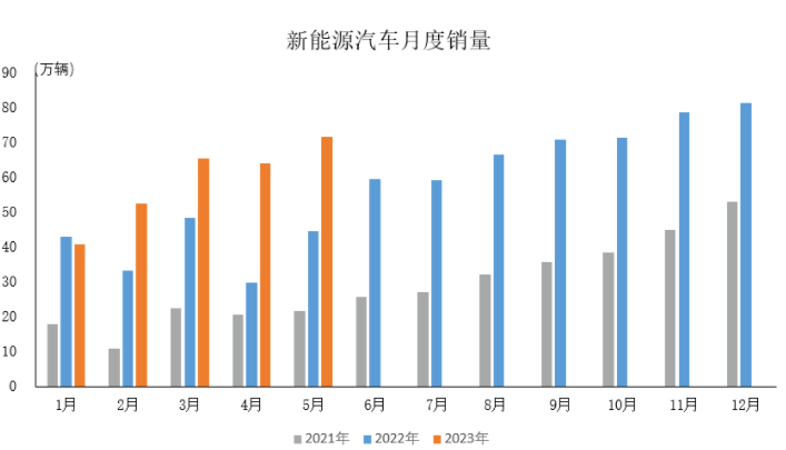 其中,5月新能源汽車產(chǎn)銷分別完成71.3萬輛和71.7萬輛,環(huán)比分別增長11.4%和12.6%,同比分別增長53%和60.2%,市場占有率達到30.1%。
