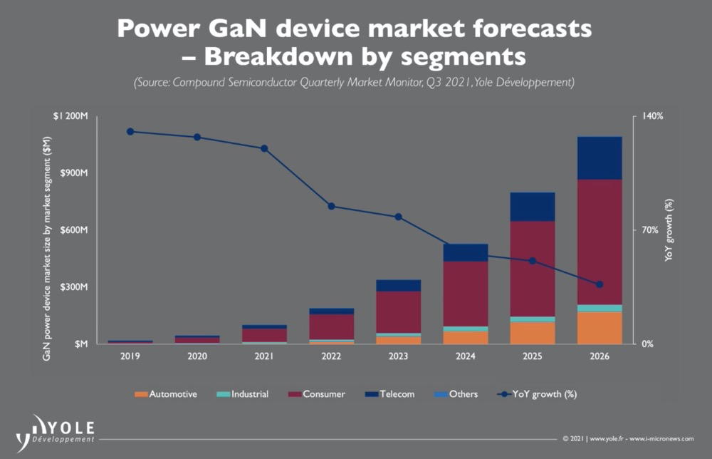 目前國(guó)內(nèi)GaN功率元件市場(chǎng)的發(fā)展主要由消費(fèi)電子所驅(qū)動(dòng),關(guān)鍵應(yīng)用為快速充電器,以及音頻、無(wú)線充電、電源和其它消費(fèi)級(jí)產(chǎn)品等應(yīng)用場(chǎng)景。據(jù)預(yù)測(cè),到2026年,氮化鎵功率器件市場(chǎng)規(guī)模將增長(zhǎng)到13.3億美元,復(fù)合增長(zhǎng)率達(dá)到65%。此外,數(shù)據(jù)中心和汽車市場(chǎng)也是氮化鎵產(chǎn)品的重要潛力領(lǐng)域,它們可以通過(guò)應(yīng)用氮化鎵產(chǎn)品來(lái)降低電力消耗和成本。