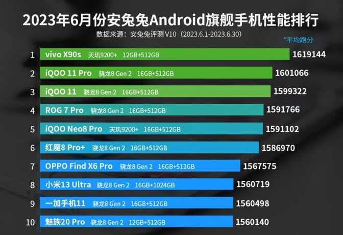先從榜單來(lái)看,高端旗艦性能機(jī)型還是蠻多的,其中包括vivo X90s、iQOO 11 Por、iQOO 11、ROG7、iQOO Neo8 Pro、紅魔8 Pro+等。