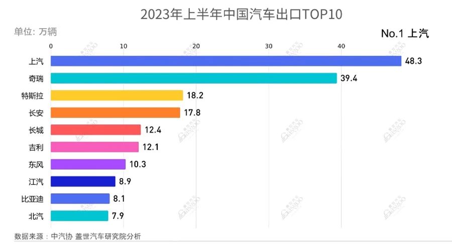 盡管中國汽車出口一度受到了特斯拉等外資車企的拉動,但據(jù)蓋世汽車統(tǒng)計數(shù)據(jù),2023年上半年中國汽車出口十大車企依次為:上汽48.3萬輛,奇瑞39.4萬輛,特斯拉18.2萬輛,長安17.8萬輛,長城12.4萬輛,吉利12.1萬輛,東風(fēng)10.3萬輛,江汽8.9萬輛,比亞迪8.1萬輛,北汽7.9萬輛。可見,還是以中國本土車企出口為主。而這個巨大的變化,僅僅發(fā)生在幾年間。