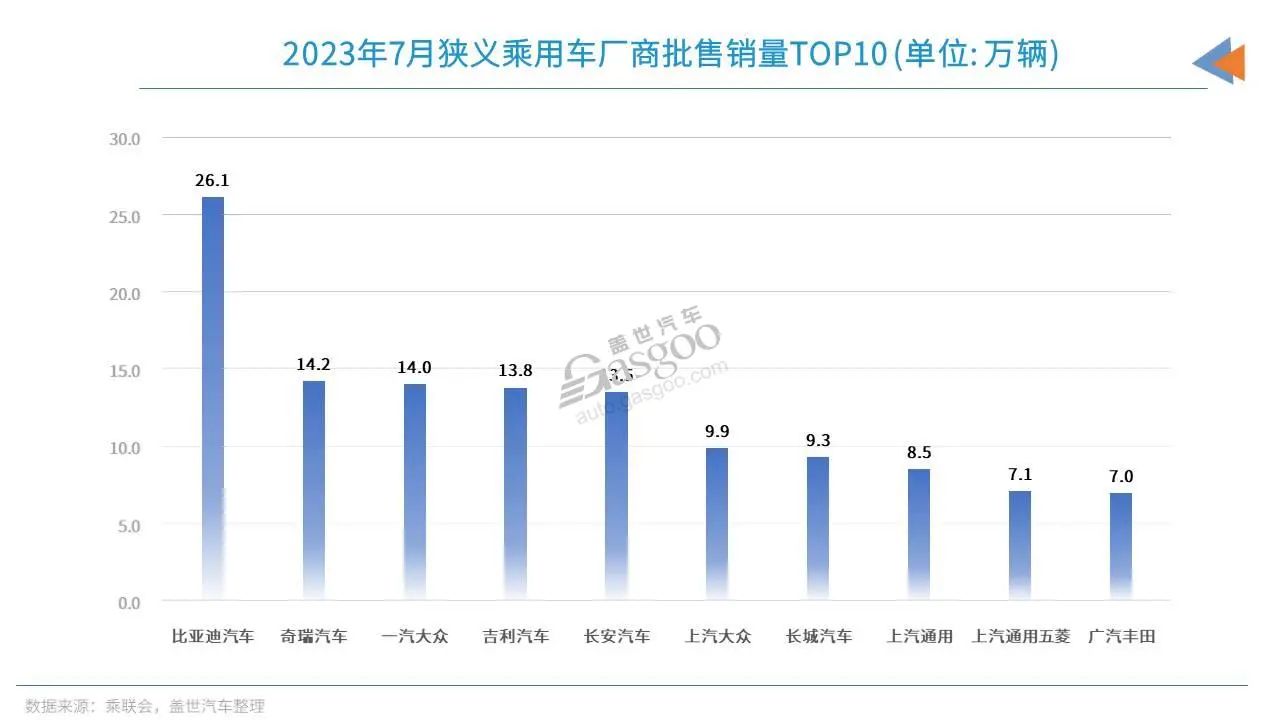 在7月車企銷量前十榜單上,自主和合資登榜的數(shù)量旗鼓相單,但月度銷量冠、亞軍,都被自主車企收入囊中。其中比亞迪依舊是一家獨(dú)大,月銷量超過26萬輛,是7月唯一一家銷量破20萬輛的國內(nèi)乘用車企業(yè)。