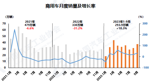 1-9月,商用車產(chǎn)銷累計(jì)完成290.7萬(wàn)輛和293.9萬(wàn)輛,同比分別增長(zhǎng)19.8%和18.3%。在商用車主要品種中,與上年同期相比,客車、貨車產(chǎn)銷均呈兩位數(shù)較快增長(zhǎng)。