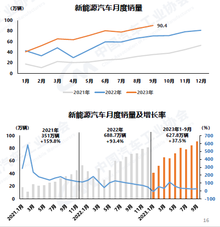 9月,新能源汽車?yán)^續(xù)保持較快增長(zhǎng)。當(dāng)月產(chǎn)銷分別達(dá)到87.9萬(wàn)輛和90.4萬(wàn)輛,環(huán)比分別增長(zhǎng)4.3%和6.8%,同比分別增長(zhǎng)16.1%和27.7%,市場(chǎng)占有率達(dá)到31.6%。在新能源汽車主要品種中,與上月相比,純電動(dòng)汽車產(chǎn)量微降、銷量小幅增長(zhǎng),插電式混合動(dòng)力汽車產(chǎn)銷兩位數(shù)增長(zhǎng),燃料電池汽車產(chǎn)量較快增長(zhǎng)、銷量明顯下降;與上年同期相比,純電動(dòng)汽車和插電式混合動(dòng)力汽車產(chǎn)銷呈不同程度增長(zhǎng),燃料電池汽車產(chǎn)銷明顯下降。