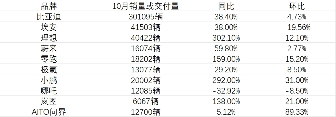 軟板廠了解到,11月1日,新能源車企相繼曬出10月銷售成績單,亮點眾多。比亞迪首次超越30萬輛大關(guān),理想汽車首次突破4萬、小鵬汽車強勢反彈至2萬關(guān)口以上、剛與Stellantis牽手的零跑創(chuàng)單月交付新高、而“遙遙領先”的AITO問界大爆發(fā)如約而至。