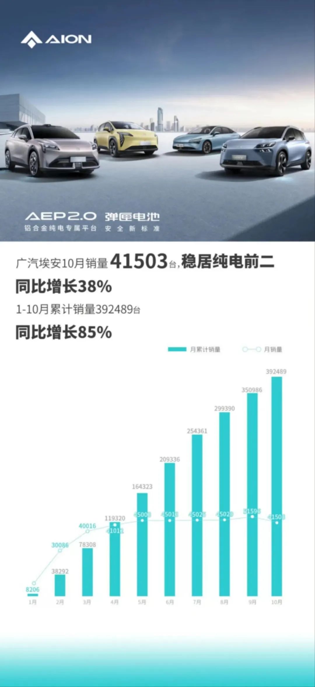 在比亞迪身后的依然是廣汽埃安,然而廣汽埃安明顯后勁不足。數(shù)據(jù)顯示,埃安10月份銷量為4.15萬輛,雖然同比增長38%,但環(huán)比上月反而下滑19.56%。