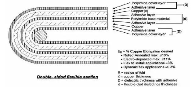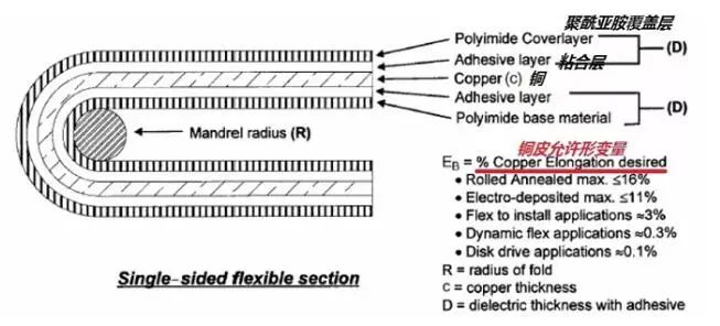 其中:R=最小彎曲半徑、單位µm、c=銅皮厚度、單位µm、D=覆蓋膜厚度、單位µm、EB=銅皮變形量,以百分?jǐn)?shù)衡量。