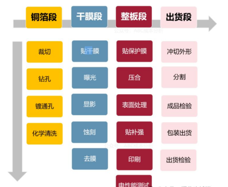 雙面板:開(kāi)料→ 烘烤→ 鉆孔→ 黑孔 → VCP→ 前處理→ 貼干膜 →曝光→ 顯影 → 蝕刻 → 脫膜 → 前處理→ 貼覆蓋膜 → 壓合 → 固化→ 表面處理→ 電測(cè)→ 裝配 → 壓合 → 固化→ 文字 →外形→ 終檢→包裝 出貨