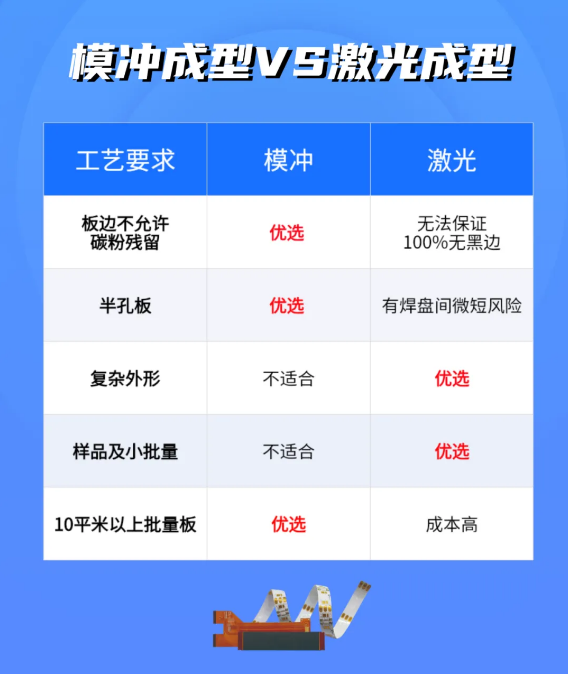 軟板模沖成型模沖沒有激光碳粉殘留問題,半孔板也不會(huì)有半孔焊盤之間存在碳粉殘留導(dǎo)致的微短問題,可配自動(dòng)沖床,生產(chǎn)效率高,成本低,但要開模具,適合大批量板。